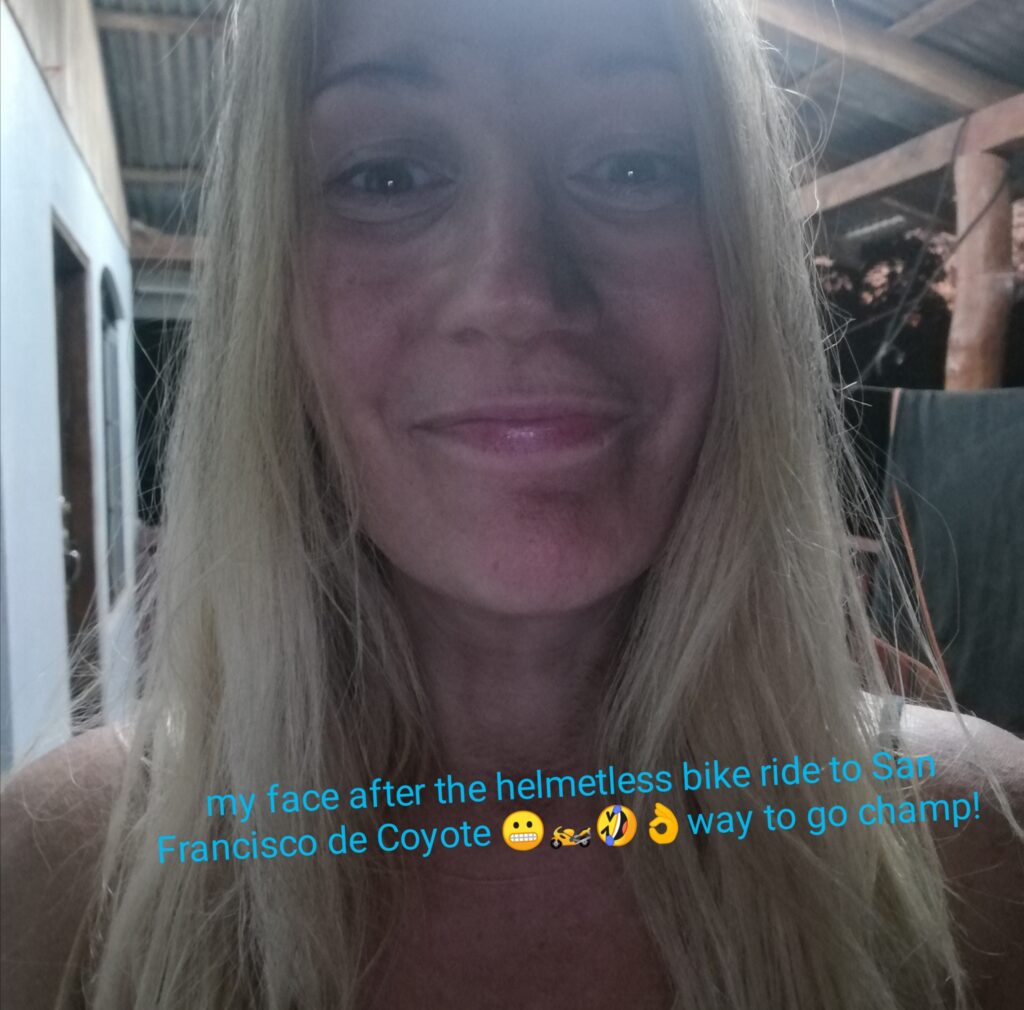 Pablo was traveling solo and hadn’t planned on having a companion on his trip to San Francisco de Coyote, which meant that “yours truly” enjoyed a wild helmetless ride! And I tell you, I knew I was breathing in some serious amount of dust from the dirt roads, and I knew it was getting it all over my arms and legs and hair, but boy… nothing had prepared me to what I saw in the mirror when we arrived at Pablo’s friends farm…!
