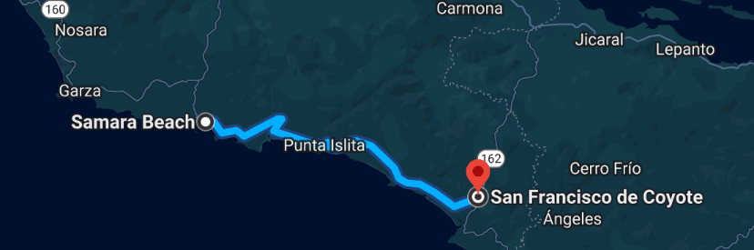 San Francisco de Coyote is situated at around 45 km from Samara if you go via the Ruta Nacional Secundaria 160, which is the one shown on the map above. But we got off from this route at some point as Pablo wanted to show me Rio Jabillo mangrove river and we also stopped at Playa Coyote before heading towards the hills, as I wanted to see why it’s such a treasured spot to Tico surfers – more on that in a minute.